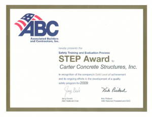Carter Concrete Structures was recently recognized by the ABC for it’s Safety Training and Evaluation Processes (STEP) and received a 2009 Gold STEP Award.