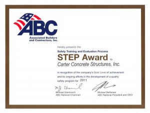Carter Concrete Structures was recently recognized by the Associated Builders and Contractors of Georgia, Inc. (ABC) for it’s Safety Training and Evaluation Processes (STEP) and received a 2011