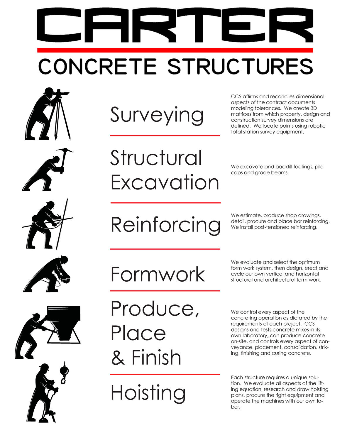 Carter Concrete Structures is a specialized Contractor operating as Subcontractor, Trade, or Prime Contractor performing turnkey concrete construction work in the commercial, institutional, industrial, and public construction markets. Scope of work typically includes structural excavation, foundations, slabs-on-grade, formwork of all types, reinforcing, concrete production, placement and finish, engineering layout, hoisting, and general conditions work on civil, industrial and multi-story structures.